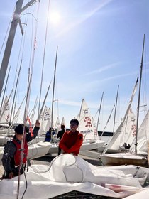 広大はその後再出艇し、セーリング練習を行いました。微風で落ち着いた海面でしたが、ヒールの量やジブセールの開き具合、リーチリボンの流れ、ブローの散らばり具合とフレ、対艇関係、角度とスピード感など、スキッパーがセーリングに1番集中できる環境をつくるために、クルーとして出来ることを常に考えながら乗りました。